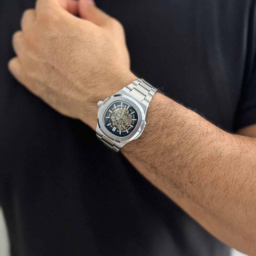 What makes it unmistakable is what you see: a fully exposed skeleton dial in deep blue, with every gear, rotor, and spring visible in real time. Engineering as art. Mechanics as identity.